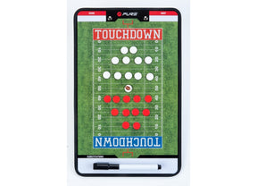Pure American Football coach board. Use this double-sided Pure2Improve magnetic dry-erase coaching board to track your team's adjustments and your stats. One side contains a full field for game diagrams, while the other side allows you to indicate the tactics being played with the white and red round magnets. You can also track errors, timeouts and other statistics. This helps you communicate better and faster what you want to convey to your team. You can also write down the main points for everyone to remember. The coach boards are made of lightweight plastic and include a whiteboard marker (easy to erase) and magnets.