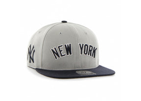 Brand '47 MLB Baseball Cap with flat visor and New York logo on the front and Yankees logo on the side. Adjustable. Two-tone.