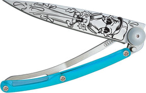 Deejo Tattoo 37g Blue Spray Zakmes. Ultra-licht. Veilig sluitsysteem en gedecoreerd met prachtige lasere gravering. Compleet met riem clip.